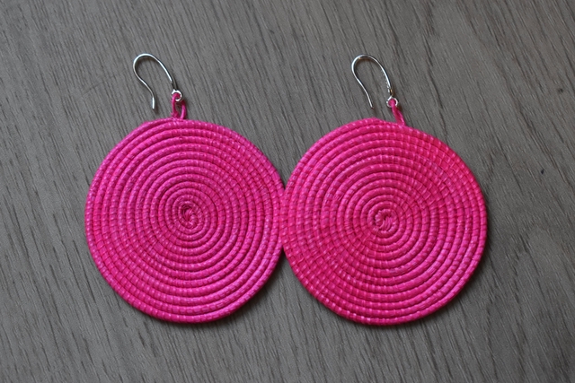 Ces boucles d'oreilles en sisal sont tressées au Kenya. Elles sont fabriquées à partir de fibres naturelles de plante de sisal puis colorées. Les fibres de sisal sont soigneusement traitées et tissées, ce qui donne des bijoux légers avec un motif élégant relevé par des couleurs chatoyantes.